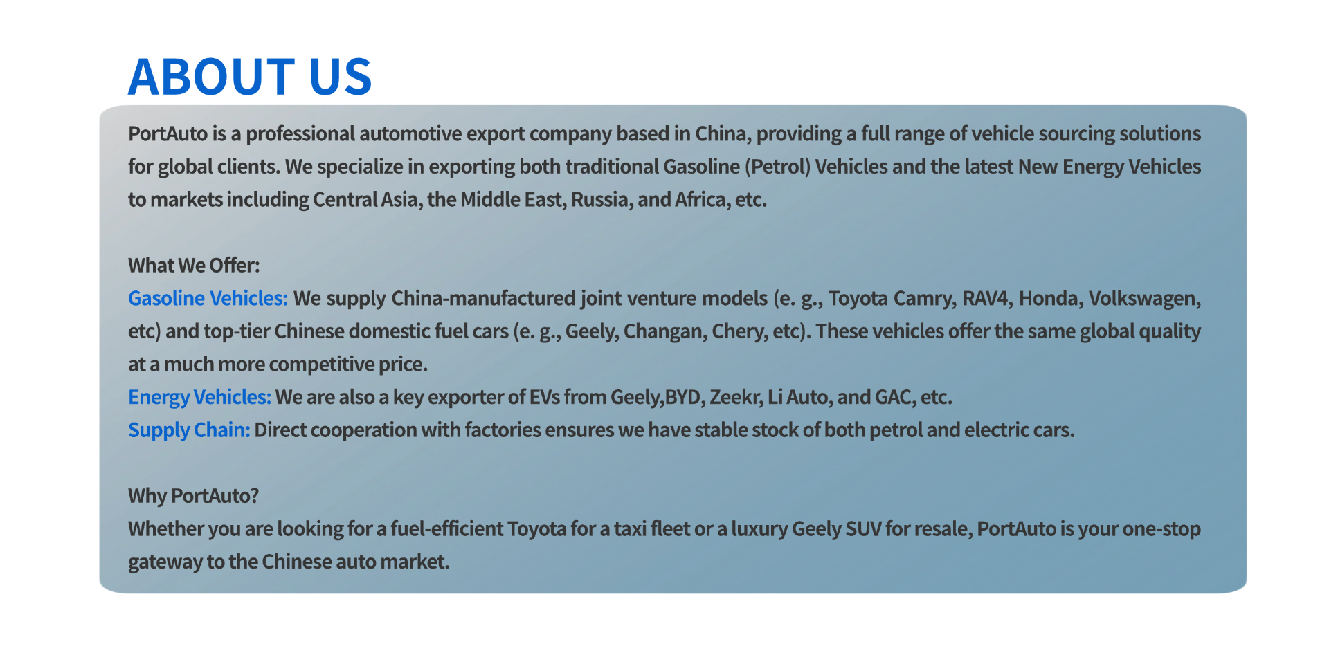 Our core competitiveness lies in our ability to accurately address your key pain points throughout the entire process of overseas car procurement, transportation, and on-site sales.